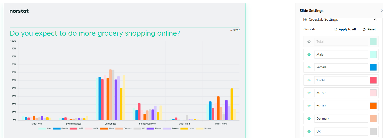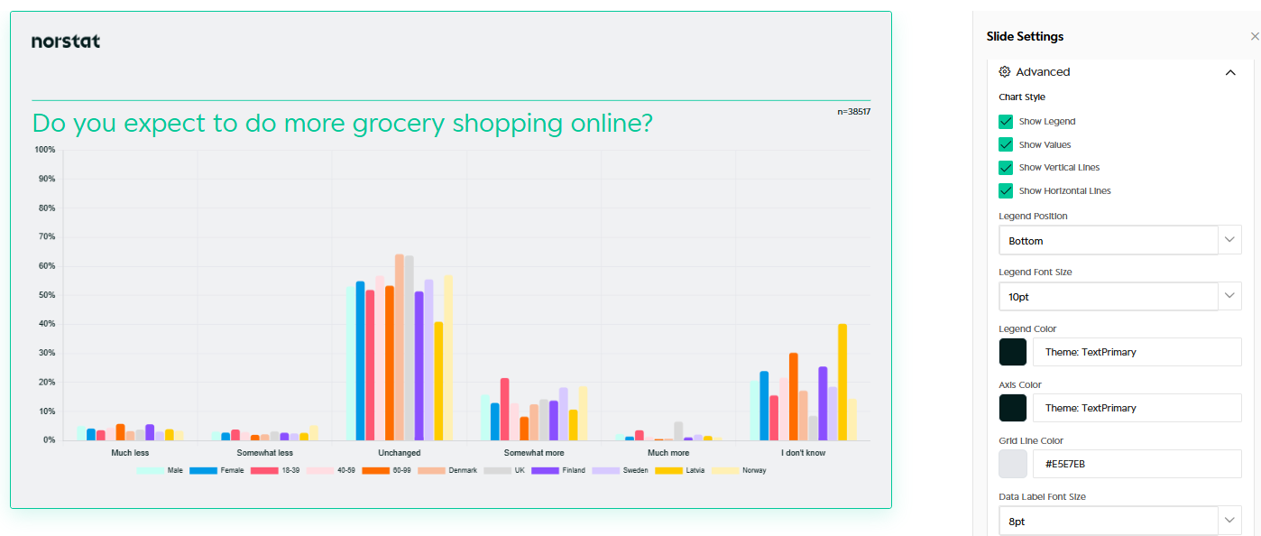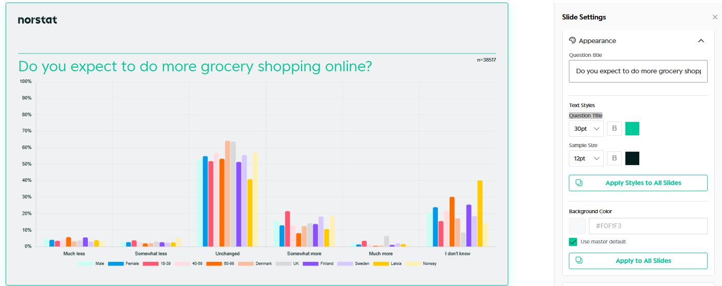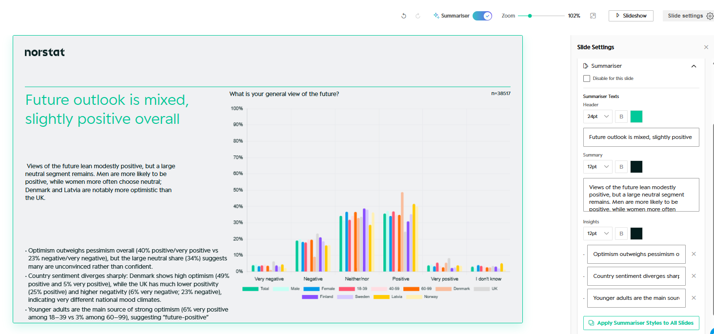 This guide explains how to work with Slides in Norstat Studio – including how to structure your deck, customise charts, apply branding, and create your own Slide Master.