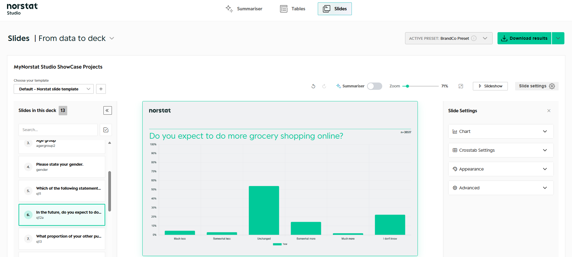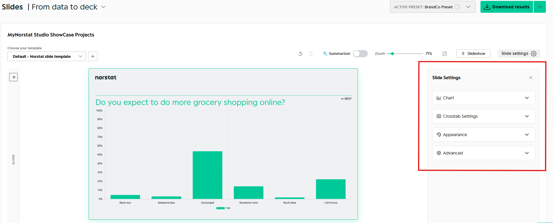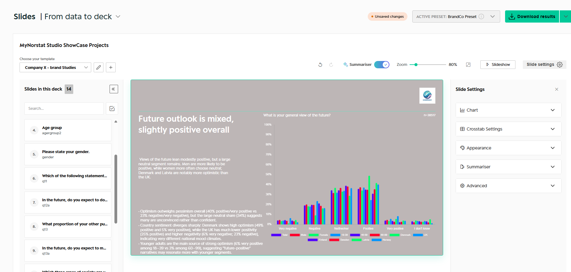 This guide explains how to work with Slides in Norstat Studio – including how to structure your deck, customise charts, apply branding, and create your own Slide Master.