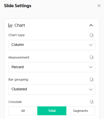 Slides are built on the same data, headers, filters, and presets as Tables, ensuring consistency across analysis and reporting.