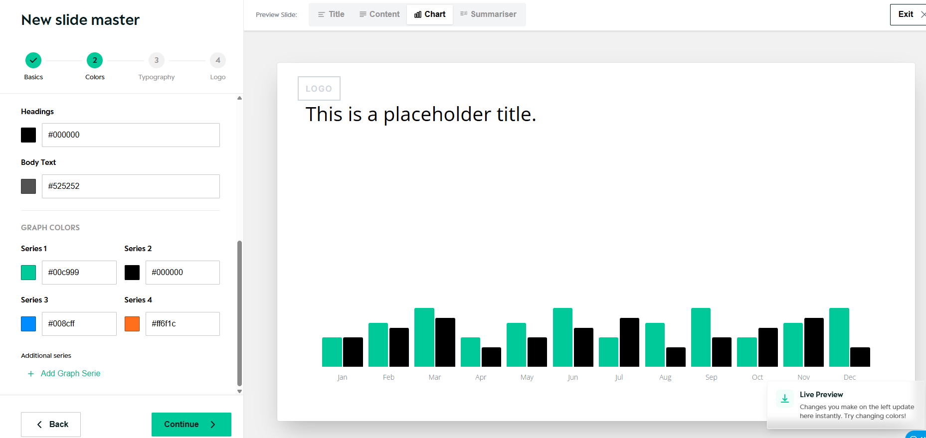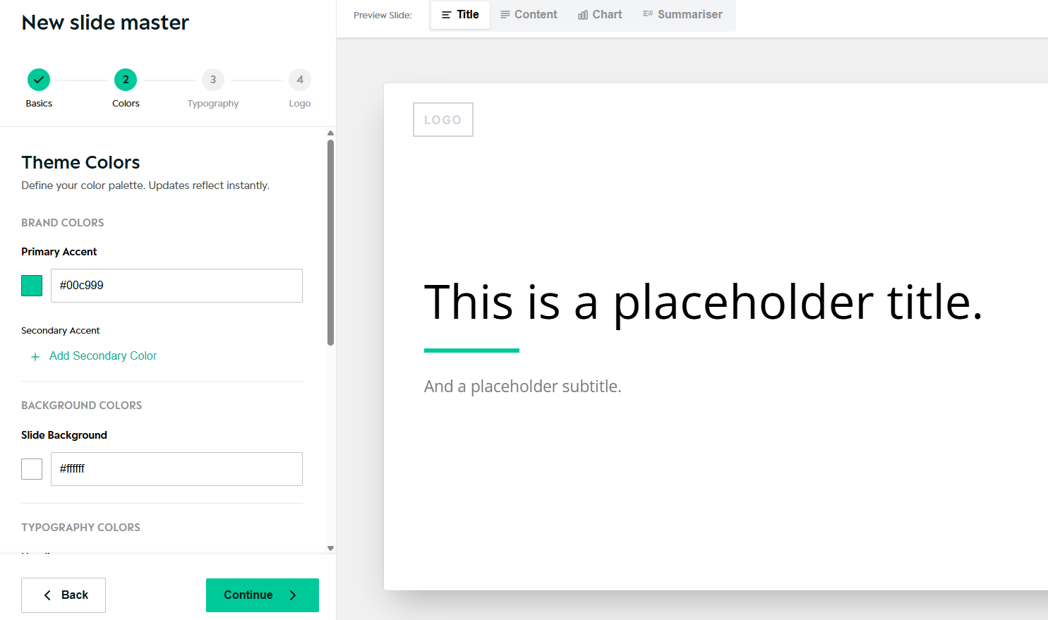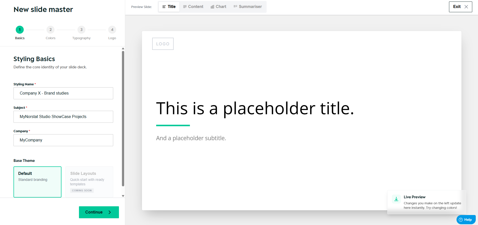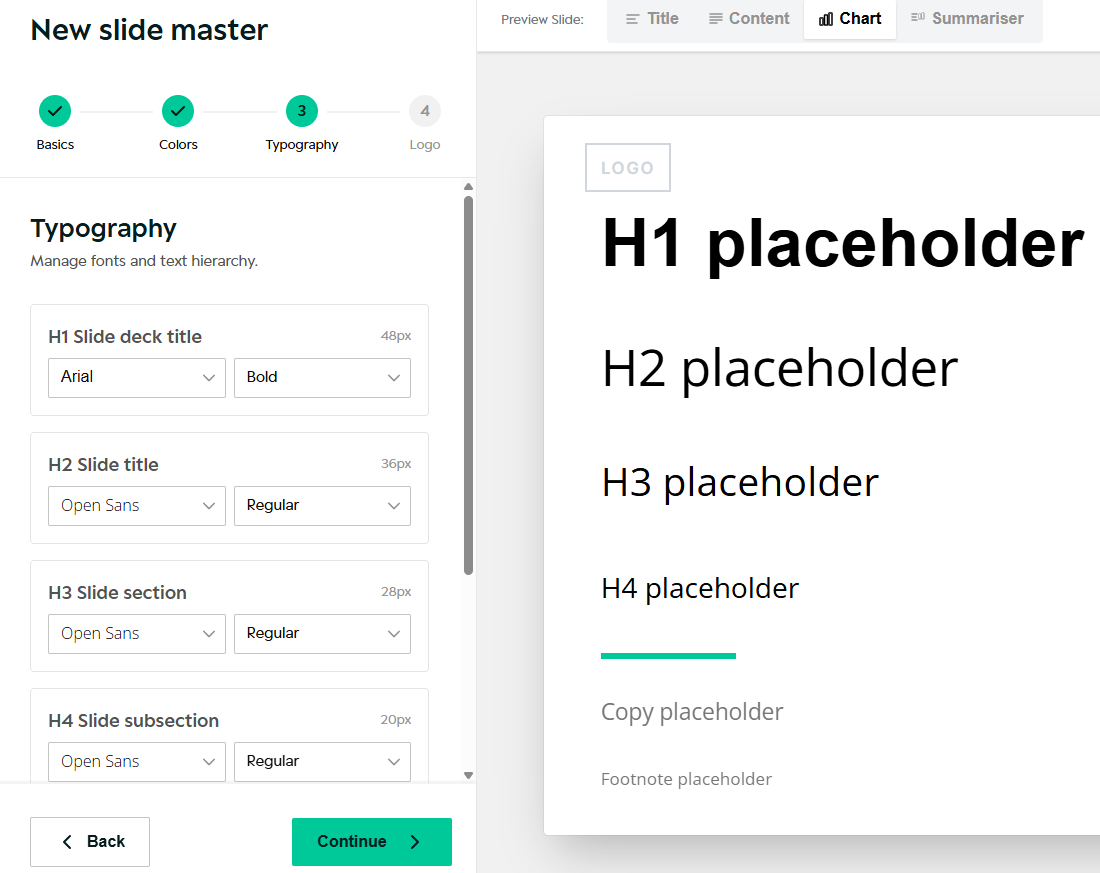 • Default layout previews (Title, Content, Chart, Summariser)
